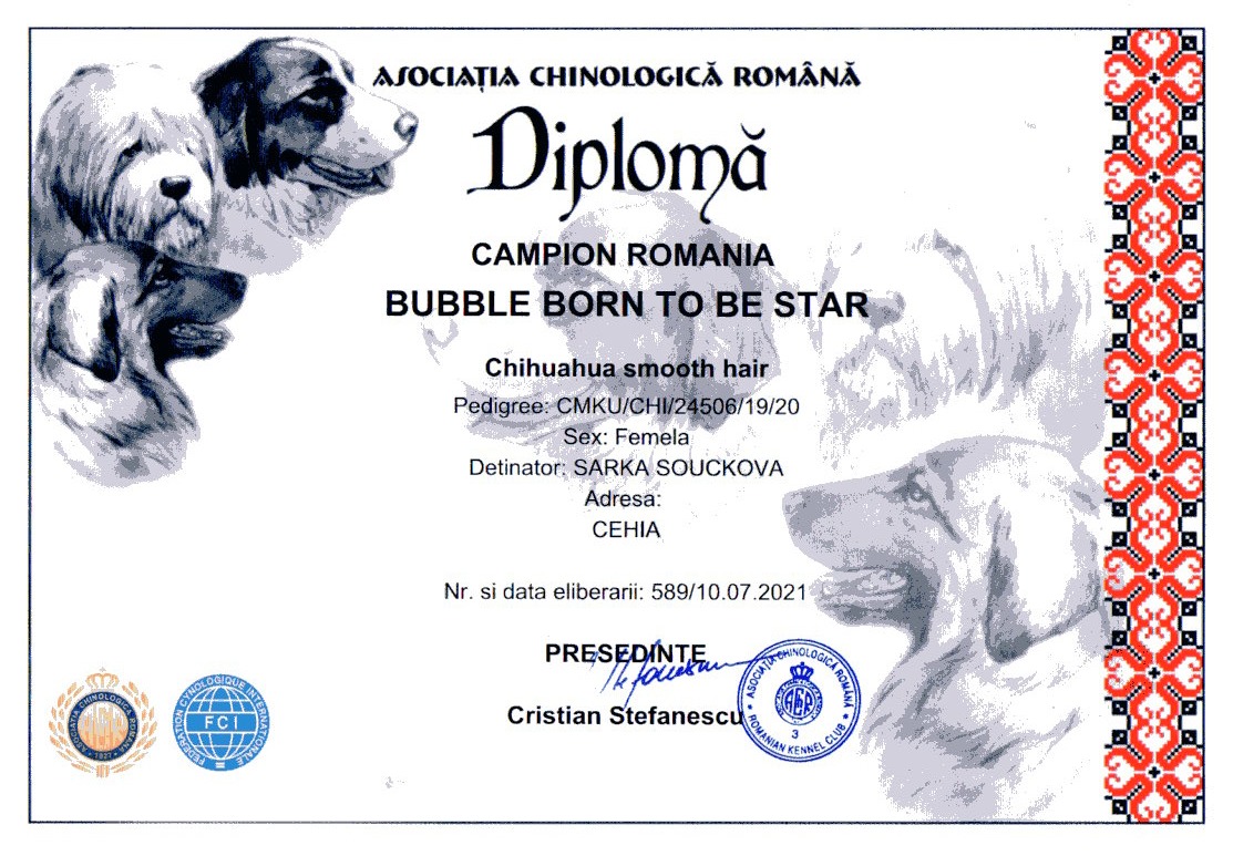 C.I.B. MEZINÁRODNÍ ŠAMPION KRÁSYTOP ČIVAVA 2021, TOP ČIVAVA 2020CAC WDS BRNO 2021GRAND ŠAMPION ČESKÉ REPUBLIKYGRAND ŠAMPION SLOVENKA GRAND ŠAMPION RUMUNSKAŠAMPION RUMUNSKAŠAMPION ČMKUČESKÝ ŠAMPION