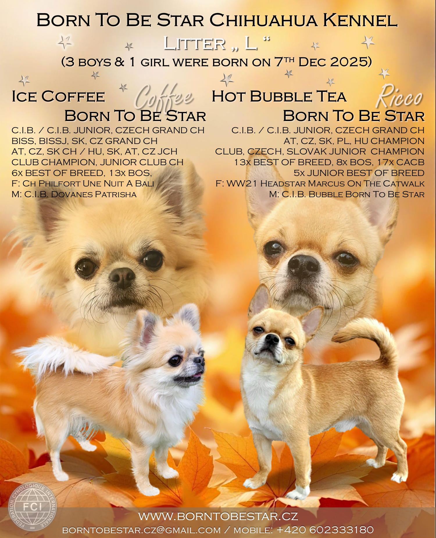 Maminkou těchto rozkošných medvídků se stala Ice Coffee Born To Be Star, náš odchov, dcera naší první dlouhosrsté čivavy Dovanes Patrisha (TESS). Coffee je stejně jako její matka úžasná, temperamentní a svou povahou jedinečná fenka. S ní se opravdu nenudíte a navíc je podle nás opravdu krásná. Coffee, stejně jako její maminka byla často úspěšná na mnoha mezinárodních výstavách. Získala tituly národního šampiona jako junior i jako dospělá v několika zemích a stala se také mezinárodním šampionem krásy C.I.B.. Jako tatínka budoucích štěňátek jsme vybrali našeho krátkosrstého psa Hot Bubble Tea Born To Be Star (RICCO). Je to úžasný, exteriérově téměř dokonalý pes s velmi zajímavým rodokmenem. Ricco je výstavně úspěšný pes, má několik juniorských i dospělých titulů a také je mezinárodním šampionem krásy C.I.B. Jeho otec je skvělý pes, Světový vítěz 2021 Headstar Marcus On The Catwalk. Jeho maminka je naše fenka Bubble Born To Be Star, která se 2x po sobě stala výstavě nejúspěšnější čivavou v ČR (Top Čivava 2021 a Top Čivava 2020), a je také mezinárodním šampionem C.I.B.